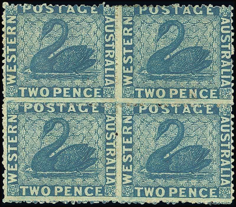 2d. blue block of four, unused without gum, a few very minor marks largely confined to reverse, otherwise fine and in above average condition. A scarce multiple. S.G. 34, £1000. Photo