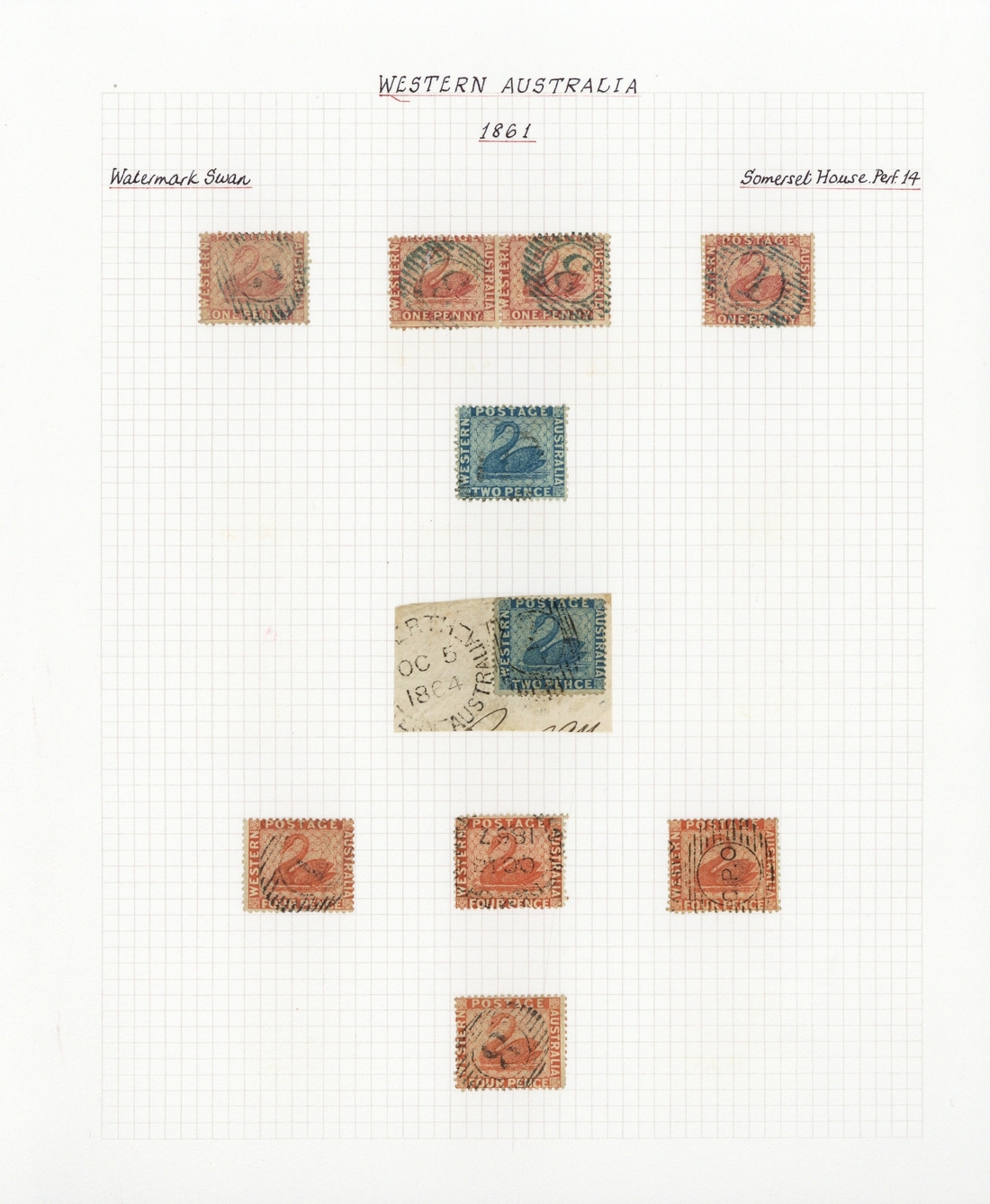 1d. rose (4 including a pair), 2d. blue (2, one on small piece) and 4d. vermilion (4), all used, one 4d. cancelled with Perth datestamp (13.10.1867), mostly fine. S.G. 38-40, £1070