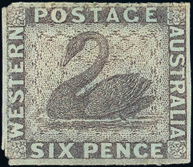 6d. purple on blued paper, unused without gum, blind perfs at left, straight-edge at foot and at right, a good space-filler of this rare stamp. S.G. 45, £3750. Photo