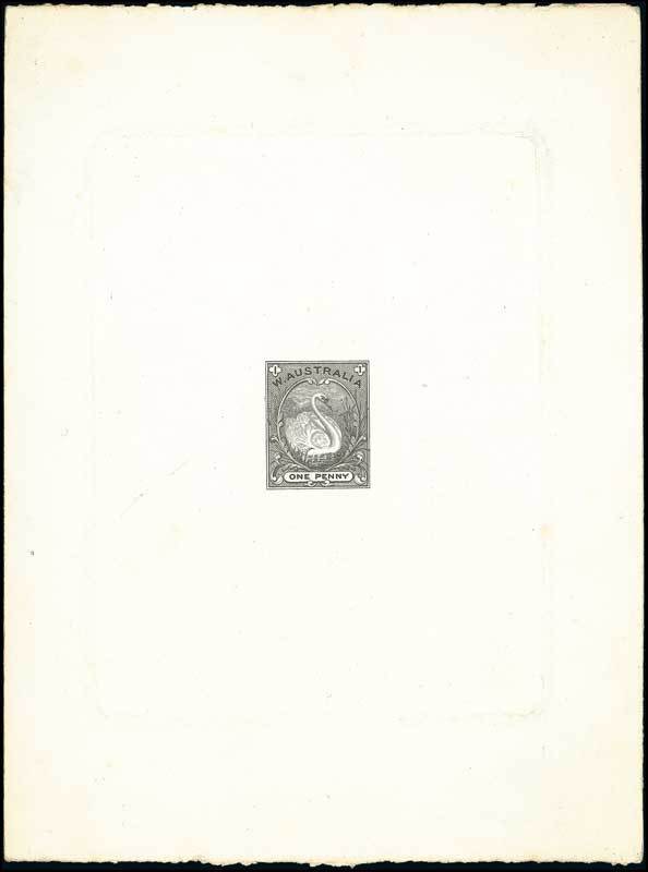 1d. essay depicting a white Mute Swan, printed in black on die-sunk card (112x150mm.); some minor soiling a edges and some light stains on reverse, none of which effect wonderful appearance. Photo