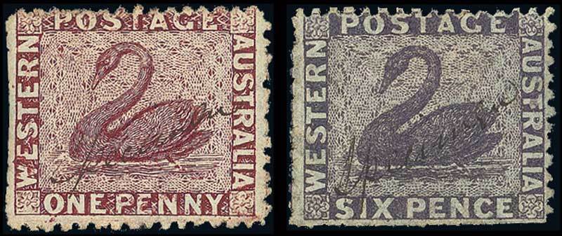 1d. lake and 6d. dull violet, both with diagonal manuscript "Specimen", both without gum, the 1d. with small thin and straight-edge at left and the 6d. with straight-edge at foot. S.G. 50, 51a. Photo