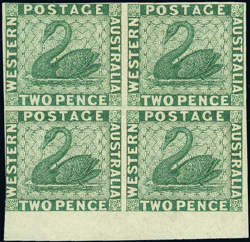 2d. in green on watermarked paper, a block of four with sheet margin at foot, the lower left stamp just cut into at left, fine. Photo