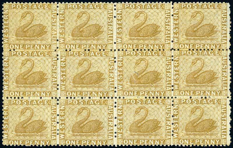 1d. bistre block of twelve (4x3) with watermark Crown to right of CC and reversed and the third vertical row watermarked "onie" of "colonies" (the centre stamp with small central defect), unused with large part original gum. S.G. 52y, £1020. Photo