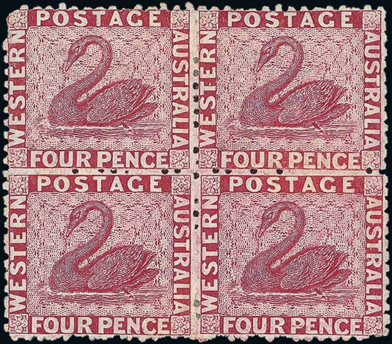 4d. carmine block of four, unused with large part original gum, the right pair with very light tone mark between, otherwise fine. S.G. 56, £520. Photo