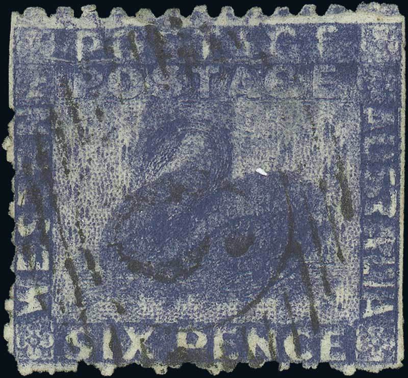 6d. violet, variety doubly printed which is very pronounced in the upper half, lightly cancelled "6" (Albany); straight-edge at right and with thin spot at foot. One of the rarest stamps of Western Australia with only three examples known in private hands, all being used. B.P.A. Certificate (2007). S.G. 57a, £22,000. Photo