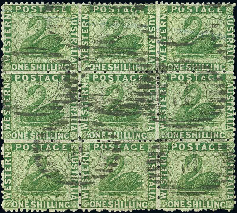 1/- bright green block of nine, all cancelled "F" (Fremantle), fine. A magnificent block, believed to be the largest known. S.G. 61. Photo