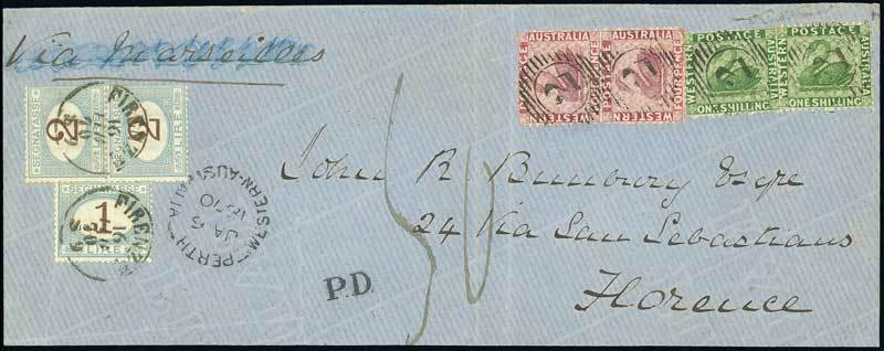 1870 (6 Jan.) envelope (215x83mm.; central fold) from Perth to Florence, marked "Via Marseilles" (deleted with blue crayon), bearing 4d. carmine vertical pair and 1/- bright green (2), each neatly cancelled "2", showing despatch c.d.s. in opposite corner, unframed "p.d." and, on reverse, Alexandria (11.2) and Brindisi (15.2) transit datestamps; upon arrival Italy Postage Due 1L. and 2L. vertical pair applied and cancelled. A scarce and most attractive franking. Photo
