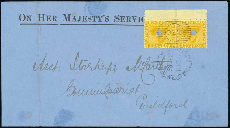 1870 (22 Sept.) double rate OHMS envelope from Perth to Guildford, bearing 2d. chrome-yellow marginal pair from the foot of the sheet both with Official central puncture, applied inverted and neatly tied by light duplex; the envelope vertical fold and a little truncated at left. Photo