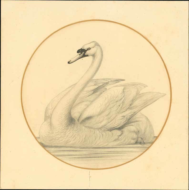 A charming pencil drawing of a white mute swan made c.1870 as a model for the centre of the typographed postage stamps, in circular format 155mm. diameter executed on thin card 195x198mm. Photo