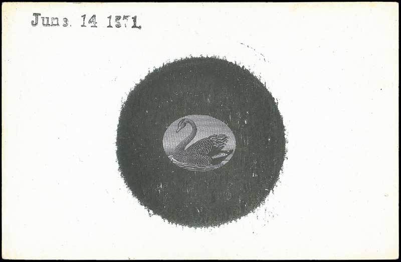 Oval vignette progressive showing uncleared rear of swan with 11mm. uncleared circular surround, in black on glazed card (92x60mm.) dated "June 14 1871", fine. Photo
