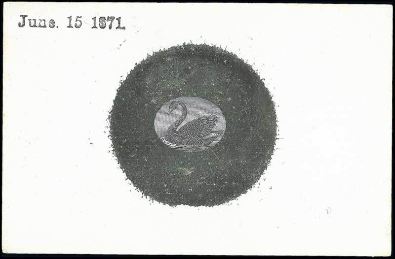 Oval vignette with engraving complete at rear of swan and showing large 11mm. uncleared circular surround, in black on glazed card (92x60mm.) dated "June 15 1871", fine. Photo