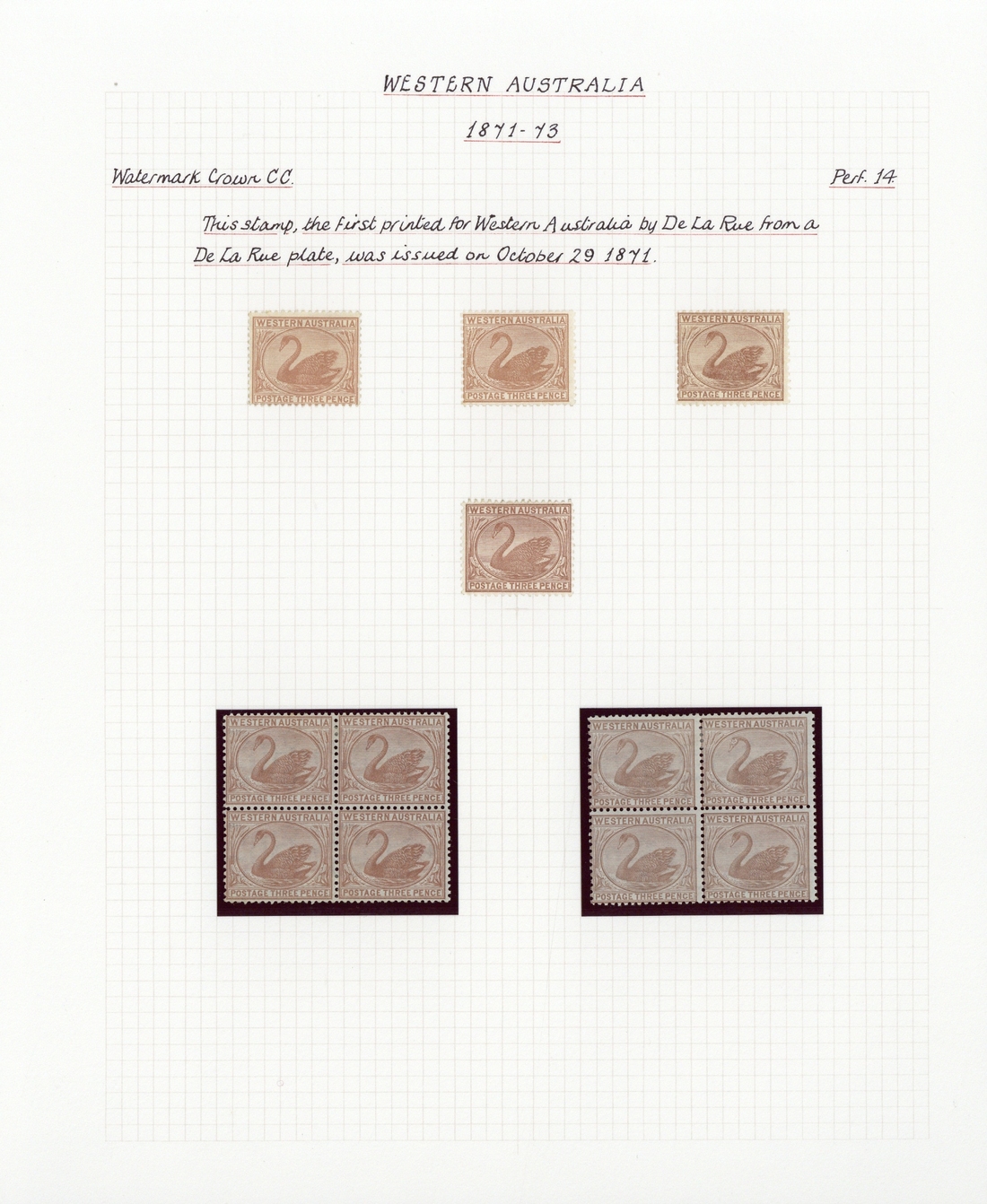 Mint blocks of four (2) and singles (5, one handstamped "specimen") and used pair and singles (5), both shades included, fine. S.G. 63, 63a; £840+