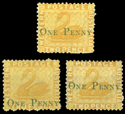 "one penny" on 2d. yellow (3) from the three surcharges identified by Mogens Juhl, all unused with large part original gum, fine. S.G. 67, £1950