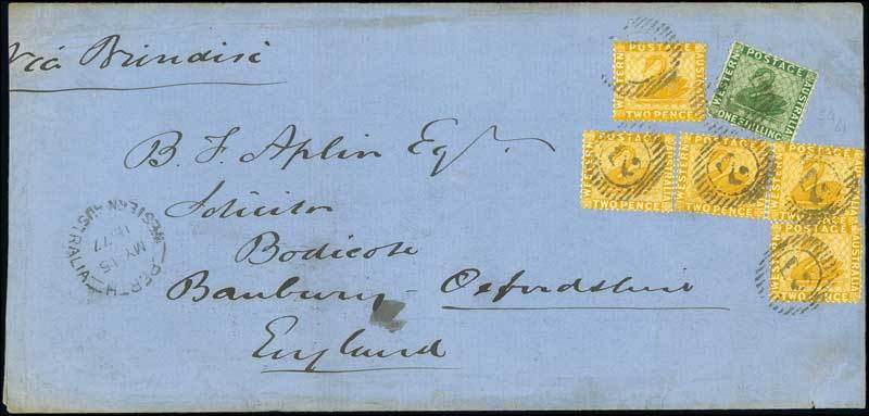 1877 (15 May) envelope (222x104mm.) from Perth to Banbury, marked "Via Brindisi", bearing 2d. chrome-yellow pair and singles (3) with 1865 1/- bright green, each cancelled "2", showing despatch c.d.s. at left with arrival datestamp (2.7) on reverse; the envelope with part flap missing a slightly truncated at left. Photo