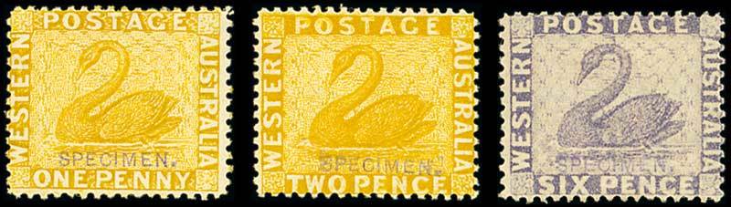 1d. yellow-ochre and 6d. reddish lilac, both handstamped "specimen" (Type WA1); 1d. yellow-ochre, 2d. chrome-yellow an 6d. lilac, each handstamped "specimen" in violet (Type D5); and 1d. yellow-ochre, 2d. chrome-yellow, 4d. carmine and 6d. lilac, each cancelled to order for presentation purposes. A fine lot. Photo