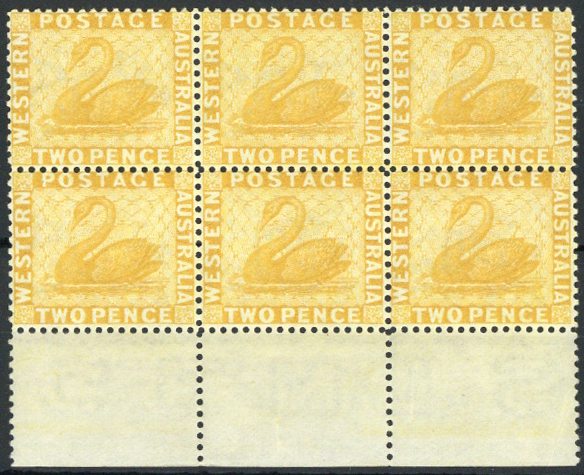 2d. chrome-yellow block of six (3x2) with margin at foot, unused with large part original gum, fresh and fine. S.G. 77, £252