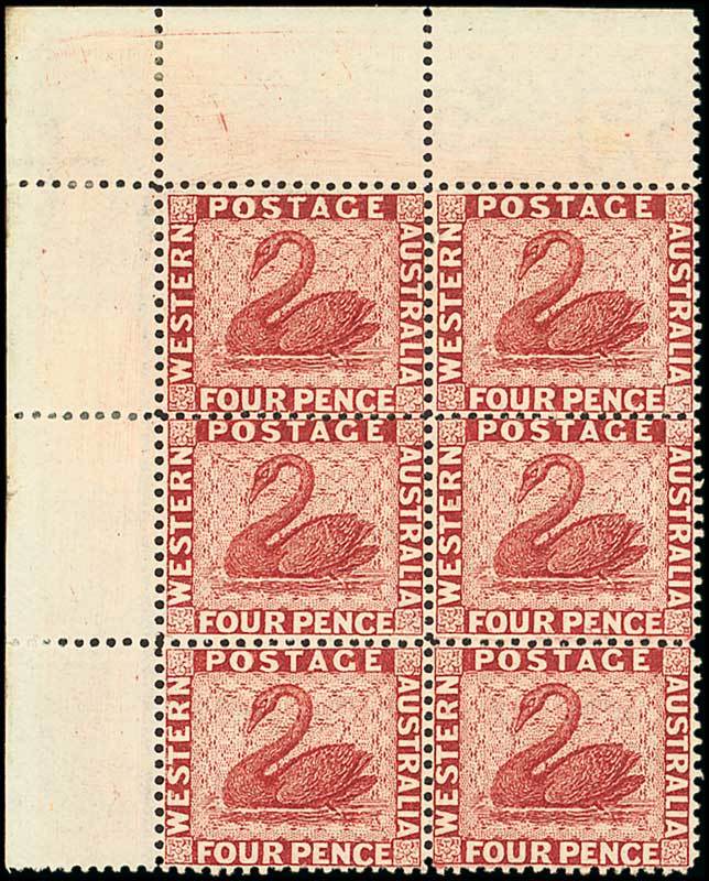 4d. carmine top left corner block of corner block of six (2x3), unused with large part or full original gum, fresh and fine. S.G. 78, £1080. Photo