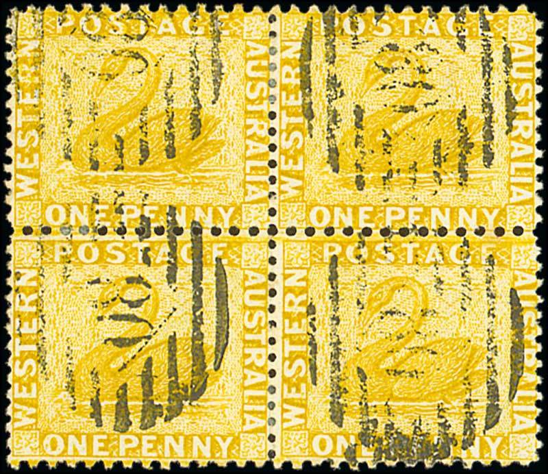 1d. yellow-ochre block of four, clearly cancelled by Perth diamond "80" duplex, fine. S.G. 81, £680. Photo