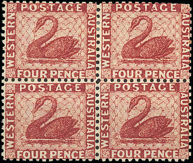 4d. carmine block of four with watermark Crown to right of CA, unused with part to large part original gum, one with perf with stain on reverse otherwise fine. S.G. 84w, £1100. Photo