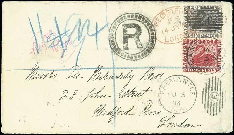 4d. carmine and perf 14 6d. lilac tied by Fremantle "f." duplex on 1884 (5 June) envelope registered to London, showing red manuscript marking, "R" in circle of bars and red arrival registered d.s. (14.7) additionally tying the stamps. A most delightful franking. Photo
