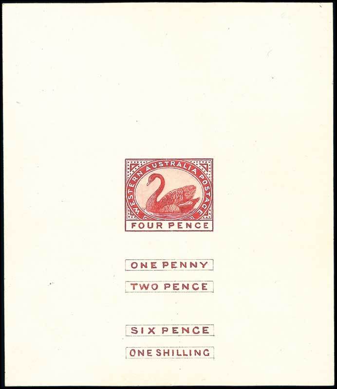 4d. stamp-size handpainted essay incorporating "western australia postage" in the design, in carmine and Chinese white on card (84x100mm.) with alternative 1d., 2d., 6d. and 1/- value tablets below. Delightful. Photo
