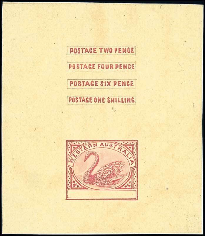 Stamp-size handpainted essay of the Key-plate in carmine with blank value tablet and showing 2d., 4d., 6d. and 1/- value tablets above incorporating the word "postage", executed on tracing paper and backed on thin card (63x73mm.). A lovely piece of the artist's work. Photo