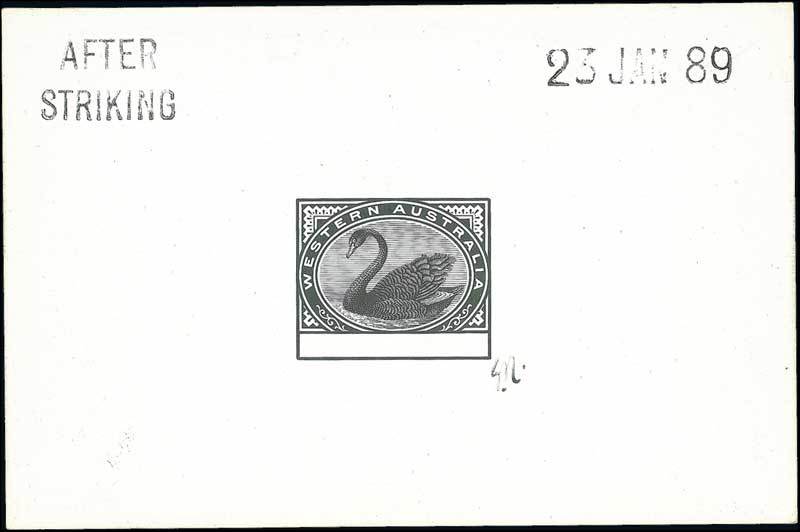 Master die proof for the 2½d. to 1/- values with blank value tablet in black on glazed card (92x60mm.), marked "after striking", dated "23 jan. 89" and initialled "GN", fine. Photo