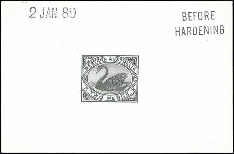 2d. complete die proof in black on glazed card (92x60mm.), marked "before hardening" and dated "2 jan. 89", fine. Photo