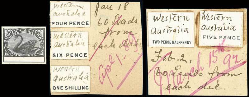 Master for the 2½d. to 1/- values with blank value tablet; 4d., 6d. and 1/- value tablets with manuscript "Western Australia" above affixed to piece (49x50mm.) dated "Jan 18" and marked "60 Leads from each duty" and further dated "Apl 1.89" in red ink; 2½d. and 5d. duty plates with manuscript "Western Australia" above affixed to piece (54x47mm.) dated "Feb 2", marked "60 Leads from each die" and further dated "March 15th 92" in red ink; all stamp-size in black on glazed card. Photo