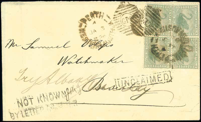 1896 (3 Jan.) envelope to Beverley, bearing ½d. (4) tied by Perth "gpo" duplex showing, on reverse, arrival c.d.s. (3.1), manuscript "If he does not call for please try Albany" and Albany d.s. (7.1) and, on face, manuscript "Try Albany", unframed "not known/by letter carrier" and framed "unclaimed"; a few minor creases. Photo