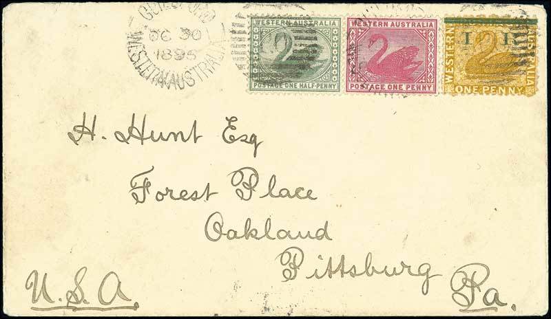 1896 (30 Oct.) envelope to Pittsburg USA, bearing ½d., 1d. and Internal Revenue 1d. yellow-ochre, all tied by Guildford "p.o" duplex and showing, on reverse, Albany (31.10) and arrival (7.12) datestamps; the envelope slightly soiled. Photo