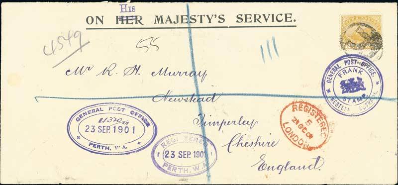 1901 (23 Sept.) OHMS envelope (222x101mm.) registered from Pert to England, bearing 5d. tied by "R" in oval, showing fine "general post office/frank/stamp/western australia" circular cachet below. fine Registered Perth oval d.s. and "general post office/perth, w.a." oval d.s., all in violet, and Registered London oval d.s. (21.10) in red. A neat and most attractive franking. Photo