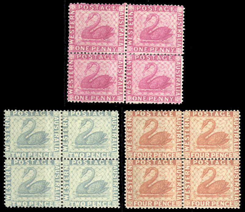 1d. carmine-pink, 2d. grey and 4d. red-brown in blocks of four, one 1d. showing "double-tailed swan", fine mint. S.G. 103-105, £756