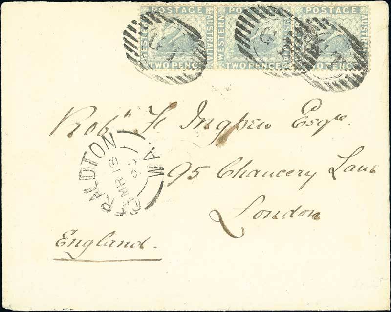 1890 (13 Mar.) envelope from Geraldton to London, bearing 2d. grey strip of three each cancelled by "G T" obliterator, showing despatch c.d.s. and, on reverse, Perth transit d.s. (24.3) partly overstruck by arrival c.d.s. (28.4). A neat and attractive franking. Photo