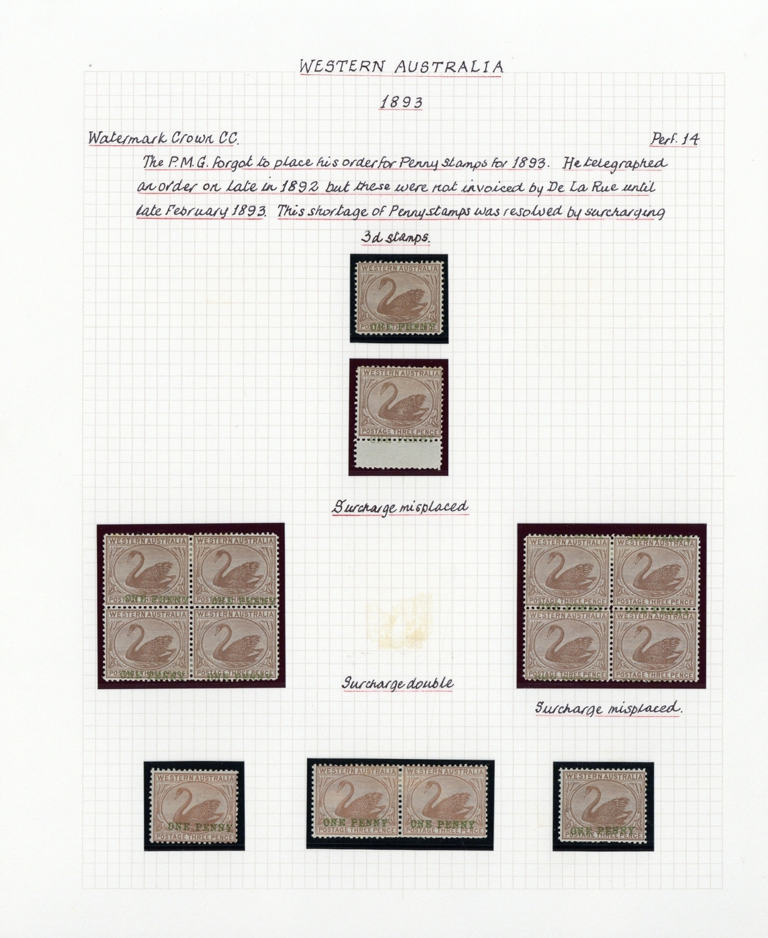 Watermark Crown CC blocks of four (2, one with surcharge misplaced on horizontal perfs between), a pair and singles (9, four mint with one showing surcharge misplaced over perforations at foot, and four used with one showing perforations misplaced over perforations at top and one with surcharge misplaced sideways); Watermark Crown CA (7, three mint with one showing surcharge misplaced over perforations at foot, and four used); condition mostly fine. S.G. 107-109, £524+