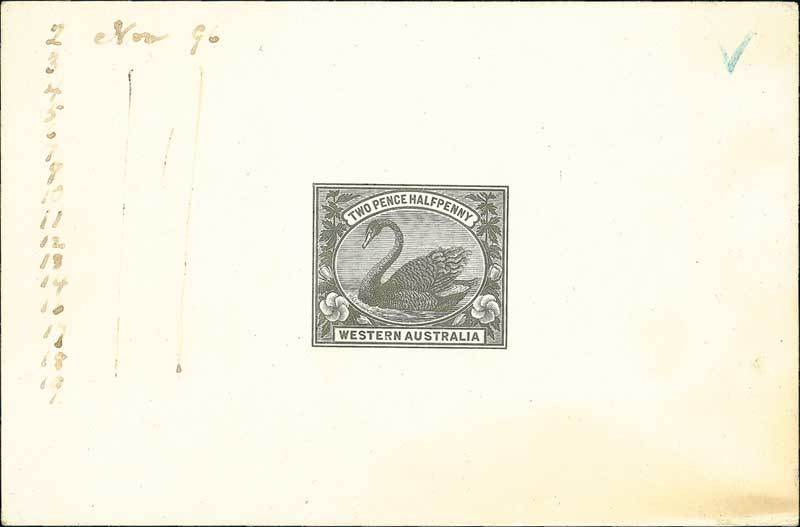 2½d. in black on glazed card (92x60mm.) showing manuscript dates of engraving at left; the card a little soiled at right. BW W1DP(1)A, $4000. Photo