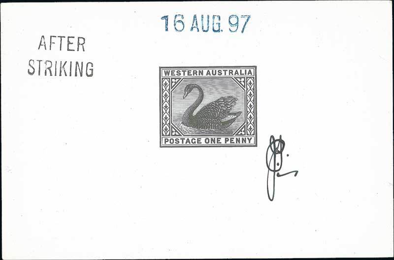 1d. in black on glazed card (92x60mm.), marked "after striking", dated "16 aug 97" and initialled, fine. Photo