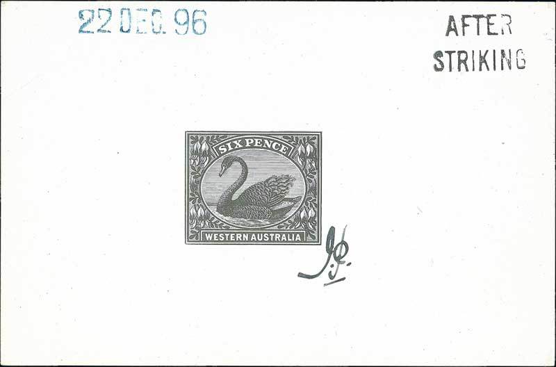 6d. in black on glazed card (92x60mm.), marked "after striking", dated "22 dec 96" and initialled, fine. BW W2DP(1)B, $4000. Photo