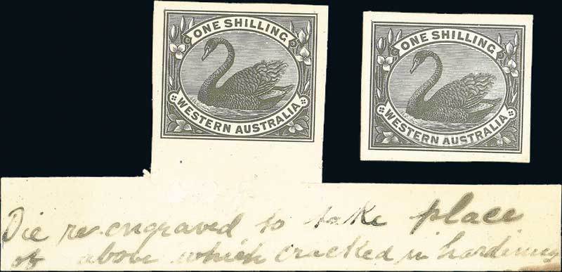 1/- Die 1 stamp-size in black on glazed card and 1/- Die 2 cut down in black on glazed card and marked at foot "Die re-engraved to take place of above which cracked in hardening", fine. BW W3DP(1), W3DP(2)A; $7500. Photo