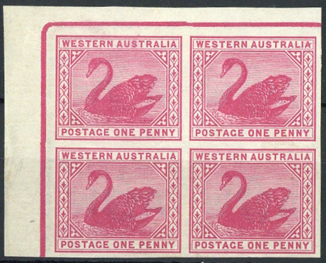 1d. carmine imperforate top left corner block of four on gummed watermarked paper, minor gum crease, fine