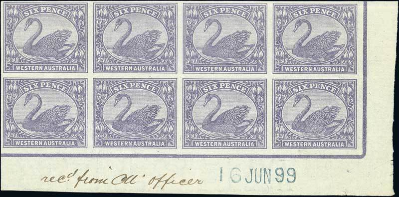 6d. bright violet imperforate lower right corner block of eight (4x2) on gummed watermarked paper, marked "rec'd from CA officer" and dated "16 jun 99" in bottom margin, fine. Photo