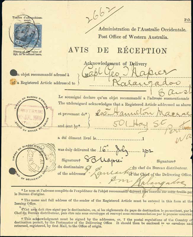 1902 (10 July) "avis de réception" of a registered article from Perth to Kalangadoo, South Australia, bearing 2½d. tied by "R" in oval; several light folds and two punch holes at left. Scarce. Photo