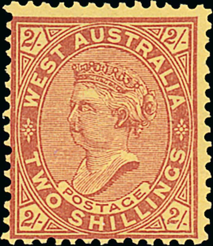 2/- bright red on yellow, variety watermark sideways with Crown pointing to right, unused with large part original gum, centred to lower left, fine. BW W59ab, $500; S.G. 124a, £250. Photo