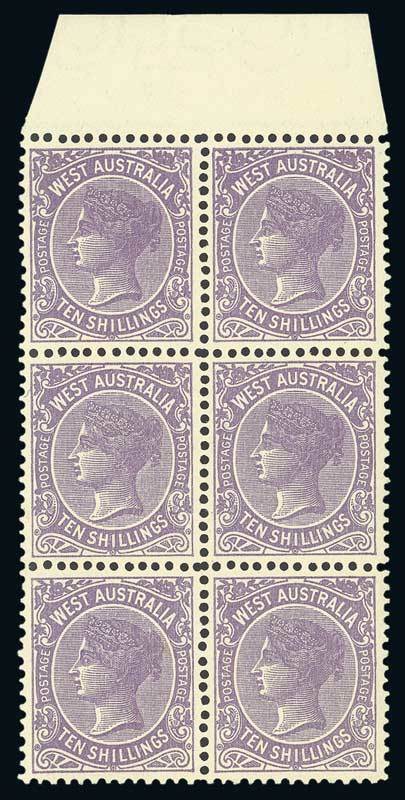 10/- deep mauve block of six (2x3) with margin at foot, variety watermark inverted, the middle left and lower right stamps are sub-type 2 (colour dot in curved leg of "r" of "australia"), mounted in the selvedge only, the odd very minor gum crease otherwise fresh and fine. A very mare multiple. BW W65Aa/e; S.G. 127var. Photo