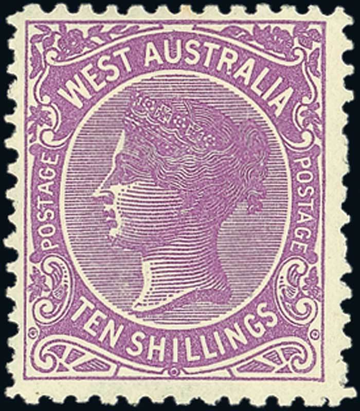 10/- bright purple, sub-type 2 (colour dot in curved leg of "r" of "australia"), unused with large part original gum, centred to upper left, fine. S.G. 127a, £850. Photo