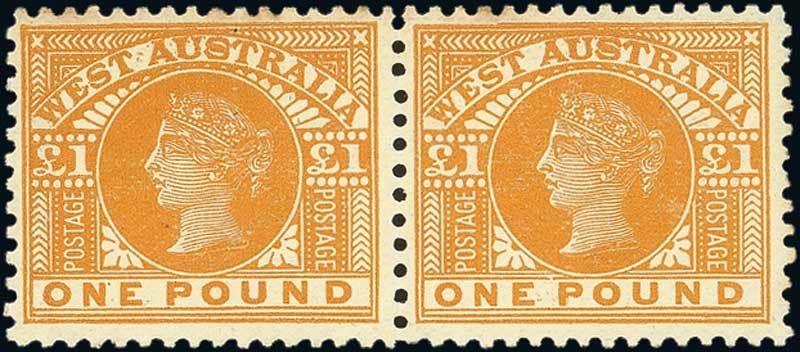 £1 orange horizontal pair, unused with large part original gum, some lightly stained perfs at top otherwise fine. S.G. 128a, £1400. Photo