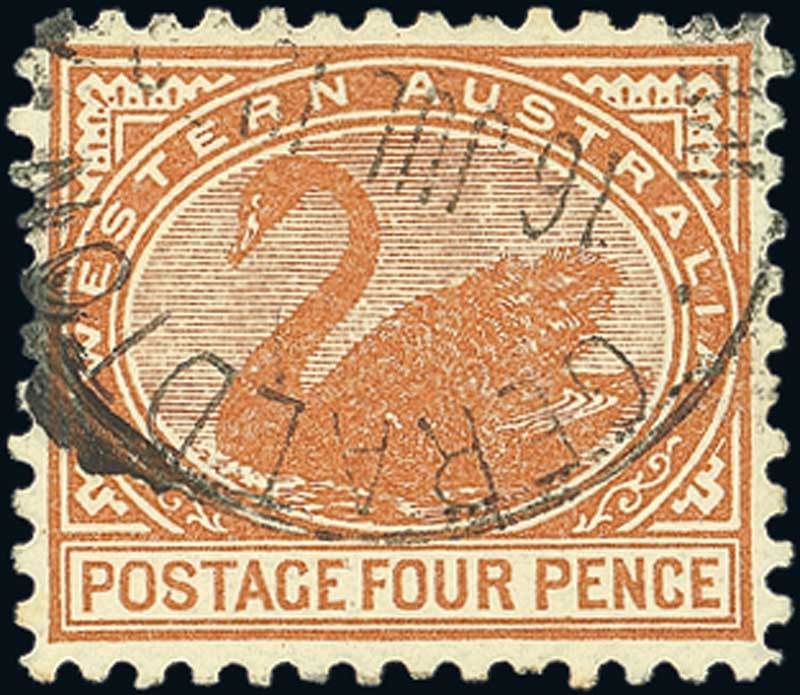 4d. chestnut, cancelled by large part Geraldton c.d.s., well-centred, fine. BW W34, $750; S.G. 131, £425. Photo