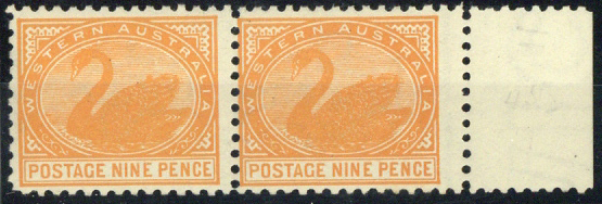 9d. yellow-orange horizontal pair with margin at right, fine mint. BW W49B, $500; S.G. 133, £340