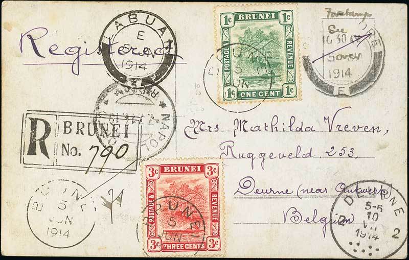 1914 (5 June) real photographic picture postcard registered to Belgium, bearing 1908-22 1c. and 3c. with, on picture side, 1c., 2c., 3c., 5c. and 1906 2c. on 3c., all tied by Brunei c.d.s., showing Type R1 registration h.s., Labuan (5.6), Singapore and Naples (7.7) transit datestamps and clear arrival c.d.s. (10.7); the 1c. with some minor discolouration around perfs. A scarce usage. Photo
