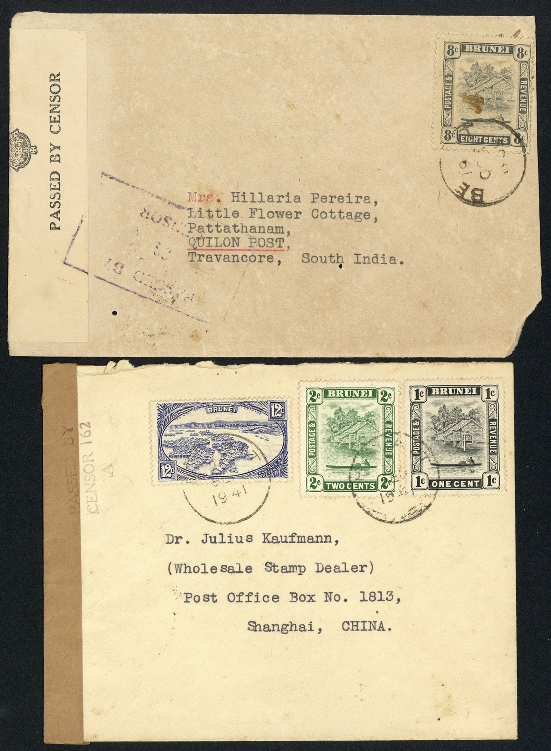 1939 (19 Oct.) envelope (small piece missing from lower right corner) to India, bearing 1933 8c. grey-black tied by Belait c.d.s., showing censor label at left tied by framed "passed by/33/censor" h.s.; 1941 (Sept.) envelope to Shanghai, bearing 1924-37 1c., 2c. green and 12c., all tied by Belait c.d.s., showing brown sealing tape at left tied by unframed "passed by/censor 162/a" h.s. in violet
